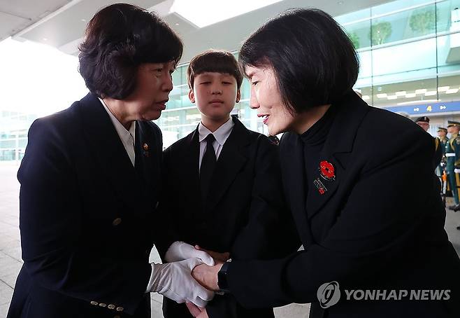 (영종도=연합뉴스) 김도훈 기자 = 국가보훈부 강정애 장관(왼쪽)이 21일 인천국제공항 제2여객터미널에서 열린 캐나다 참전용사 고(故) 윌리엄 존 크라이슬러 씨의 유해 봉환식이 끝난 뒤 부인 경자 크라이슬러씨와 손자 윌리엄 크라이슬러 군을 위로하고 있다.