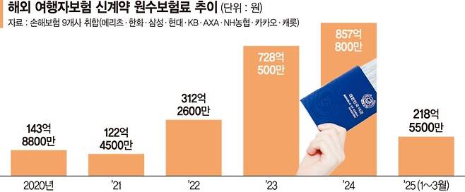 21일 보험업계에 따르면 올해 들어 3월까지 누적 개인 해외여행자보험을 판매하는 9개 손해보험사의 원수보험료는 모두 218억5500만원으로 전년동기 대비 2.6% 늘었다. 개인의 해외여행자보험 가입 건수는 66만4673건에서 76만4792건으로 15.1% 증가했다.
