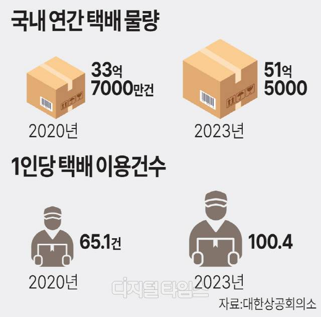 대한상공회의소의 '택배산업 현황 및 성장 요인 보고서'에 따르면 국내 연간 택배 물량은 2020년 33억7000만건에서 2023년 51억5000만건으로 52.9% 늘었다. 1인당 택배 이용 건수는 2020년 65.1건에서 2023년 100.4건으로 증가했다.
