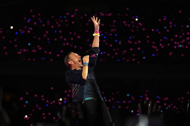 | ▲ 콜드플레이의 크리스 마틴이 나비뭄바이의 D. Y. 파틸 스포츠 스타디움에서 열린 콜드플레이의 뮤직 오브 스피어(Music Of The Spheres) 전 세계 순회 공연에서 공연을 펼치고 있다. 2025.1. 18 |