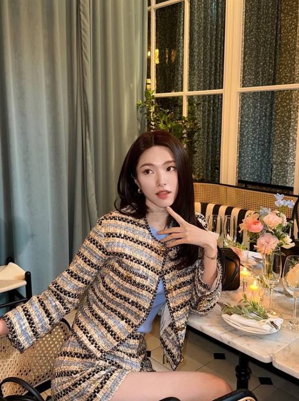 고급스러운 트위드 재킷과 스커트 차림으로 레스토랑에서 포즈를 취하는 사진에서는 세련된 스타일링과 우아한 분위기가 인상적이다.