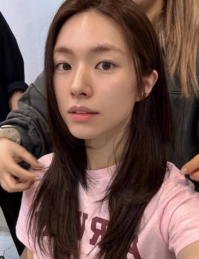 또다른 사진에서는 메이크업을 받으며 카메라를 응시하는 모습으로 수수한 핑크 티셔츠와 내추럴 메이크업으로 청순한 분위기를 자아내고 있다.