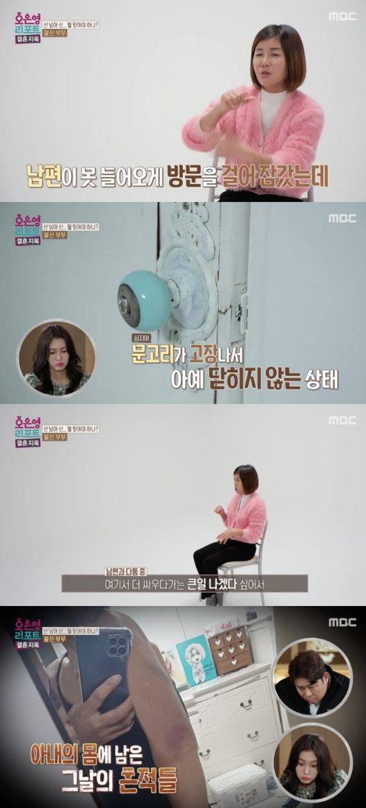 아내는 “언쟁을 하다가 남편이 못 들어오게 방문을 걸어 잠갔다. 바로 발로 문을 찼다. 문고리가 고장 나서 잠기지 않는다. 처음에는 물건을 향했는데 나중에는 목을 졸랐다. 여기서 더 싸우다가는 큰일 나겠다 싶었다. 나가려는데 저를 침대로 밀쳐서 암바를 했다. 저도 방어할 도구를 찾았다. 아무것도 안 잡혀서 항복한다고 벽을 쳤는데도 끝까지 힘을 풀지 않더라. 나를 진짜 죽일 생각이네”라고 말했다. 아내의 몸에 그날의 흔적이 멍으로 고스란히 남았다.