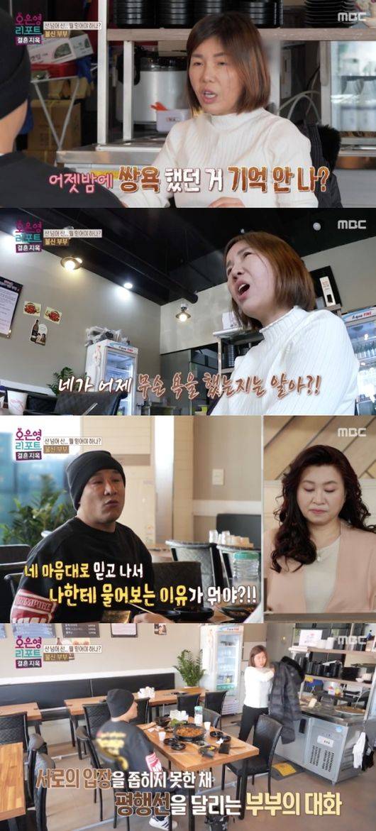 아내는 “내 입 다치게 한 것 기억나냐”라고 물었고 남편은 “너한테 맞아서 상처 난 게 더 많다”라고 맞받아쳤다. 아내는 “나도 눈 뒤집혀서 뭐라도 손에 잡히는대로. 같이 맞서 싸우느라 내 방어한 것이다”라고 말해 모두를 충격에 빠지게 했다. 남편은 “너나 나나 똑같은 사람이다. 너는 나한테 그렇게 잘했냐”라고 말했고 두 사람의 관계는 더욱 꼬여버렸다.