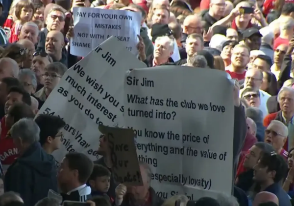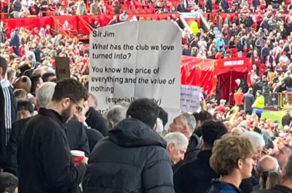 아울러 짐 랫클리프 구단주를 겨냥한 강한 걸개 메시지를 공유했다. 걸개에는 “랫클리프 경, 우리가 사랑하던 구단은 대체 뭐가 됐나? 당신은 모든 것의 가격은 알지만, 가치는 모른다”, “팬보다 관광객이 우선”, “수십 년의 사랑이 팔려나갔다”라는 문구가 적혀 있었다.