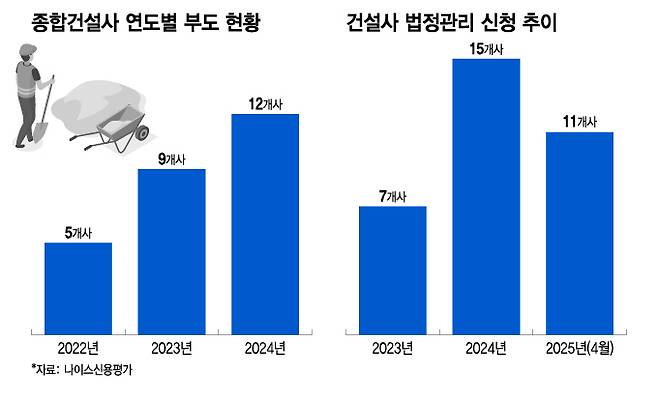 21일 나이스신용평가에 따르면 국내 종합건설사 연간 부도 건수는 2022년 5개사에서 2023년 9개사, 2024년에는 12개사로 매년 늘었다. 최근 3년간 부도난 26개사 중 25개사는 지방에 사업 기반을 두고 있는 건설사다. 주택 분양시장 위축에 따라 수주 감소와 자금 회수 지연이 이어지고 차입금이 빠르게 증가하면서 풍파를 피하지 못했다.