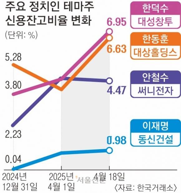 보수진영 테마주도 비슷한 양상이다. 한덕수 대통령 권한대행 국무총리의 테마주인 대성창투, 한동훈 전 국민의힘 대표와 연관된 대상홀딩스, 안철수 국민의힘 의원 테마주인 써니전자 등의 신용잔고 비율도 많게는 2배 이상 불었다.