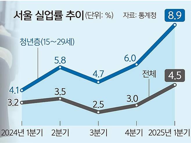 21일 통계청의 ‘서울시 2025년 3월 고용동향’에 따르면 올해 1분기 서울 청년층(15∼29세)의 실업률은 8.9%로, 전년 대비 4.8%포인트 상승한 것으로 나타났다. 취업시장 문이 좁아지면서 구직 단념층이 늘어나며 실업 상태인 청년 비중이 증가하고 있다는 분석이다. 실제 ‘그냥 쉬었음’ 청년 인구는 3월 기준 전국 약 45만명에 달해 1년 새 5만2000명이나 늘어났다. 장기적인 구직 단념 상태가 되면 외부와 단절되는 ‘은둔·고립’ 상태로 이어져 사회적 문제로 이어지는 부작용까지도 우려된다.