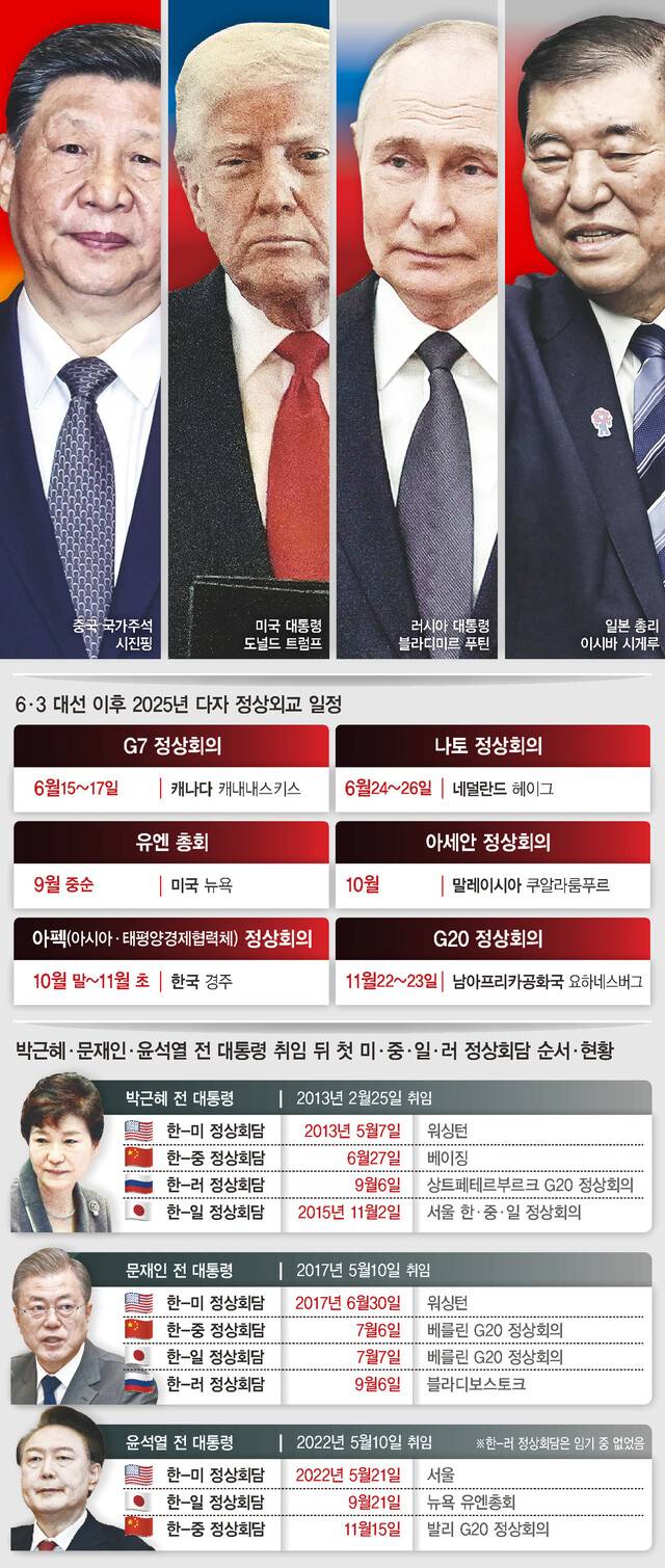 실질적 고민거리는 주변 4국 가운데 미국 다음 양자 정상회담 상대로 어느 나라를 선택하느냐다. 박근혜·문재인 전 대통령은 중국을 선택했는데, 반북·반중·반러 기조를 숨기지 않은 윤석열 전 대통령은 일본을 골랐다. 다수의 외교 분야 관계자들은 “새 대통령의 두번째 정상회담 상대국으로는 일본보다 중국을 택해야 할 상황”이라고 말한다. 청와대 안보실 출신 고위 인사는 “시진핑 중국 국가주석이 경주 아펙 정상회의 참석을 ‘진지하게 고려하겠다’고 한 만큼 그에 앞서 새 대통령이 중국을 방문하는 문제도 검토할 필요가 있다”고 했다. 6월22일 서울과 도쿄에서 함께 열릴 한-일 수교 60돌 기념행사를 한-일 정상회담의 무대로 활용할지, 원래 계획대로 외교장관 수준에서 대처할지도 판단해야 한다.