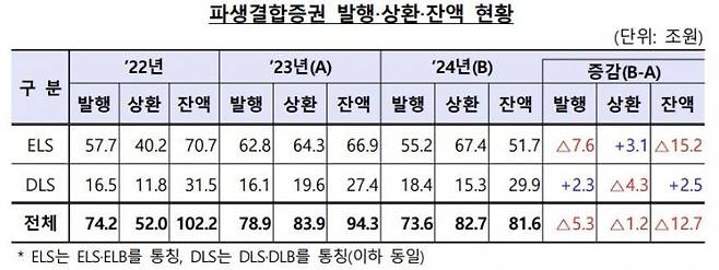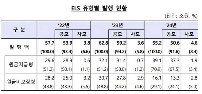 세부적으로는 작년 말 ELS 발행액이 55조2000억원으로 전년 대비 7조6000억원 감소했다. 2022~2024년 중 최저치다.