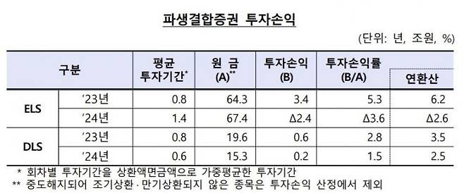 작년 실제 상환이 이뤄진 파생결합증권 투자자의 이익 및 수익률은 ELS와 DLS 모두 감소했다. H지수 기초 ELS의 만기도래 집중으로 손실이 확정됐기 때문이다. 작년 ELS의 투자손익률은 연환산 -2.6%였다. 전년 6.2% 이익에서 손실로 전환한 것이다. DLS도 2.5%로 2023년 3.5% 대비 감소했다.
