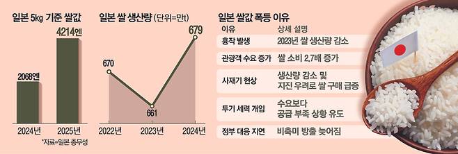 일본의 외국인 관광객이 2023년 6월부터 1년간 소비한 쌀은 약 5만1000t으로 전년 동기 대비 2.7배 늘어났다. 초밥과 덮밥 등 일본 주요 음식이 쌀 중심으로 이뤄져 있어 관광객들의 수요가 일본 쌀 시장에서 공급 부족을 초래했다. 내국인 쌀 수요는 크지 않았다. 일본의 1인당 연간 쌀 소비량은 2012년 56.2㎏에서 2022년 50.9㎏으로, 10년간 약 10% 줄어들었다.