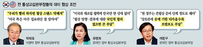 전직 통상 수장들은 방어적 태도에 그치지 말고 받을 것은 받아낸다는 태도로 협상에 임해야 한다고 주문했다. 여 전 본부장은 “다른 나라들도 다 관세를 맞았기 때문에 다른 나라들보다 유리한 조건을 얻어내면 성공한 협상이 된다”고 했다. 또 군함 등 선박의 나라 밖 건조를 금지하는 미국 법령의 적용 예외 등을 얻어내는 것도 추진할 만하다고 조언했다. 유 전 본부장은 한국의 주력 수출품인 자동차와 반도체(관세 부과를 위한 조사 진행 중) 등에 대한 품목별 관세도 의제로 삼을 필요가 있다고 말했다. 그는 “미국이 제조업 협력을 하기에 우리만큼 좋은 상대가 없다”며 ‘제조업 부활’을 외치는 트럼프 행정부에 한국의 제조업 경쟁력을 무기로 협력 강화와 양보를 얻어낼 필요가 있다고 했다.
