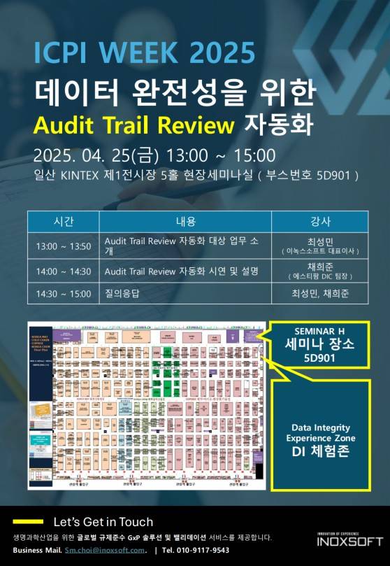한편 이녹스소프트는 오는 4월 22일부터 25일까지 일산 킨텍스에서 개최되는 제약·바이오 전문 전시회 'COPHEX 2025'에서 DIMS를 첫 공개한다. 전시 기간 중 이녹스소프트 부스에서는 체험존이 운영되며 실제 시스템 화면을 통해 감사추적(Audit Trail) 검토가 어떻게 자동화되는지 직접 확인해볼 수 있다. 25일에는 데이터 완전성을 위한 Audit trail review(전자 데이터와 점검 기록 검토) 자동화 세미나도 개최한다.