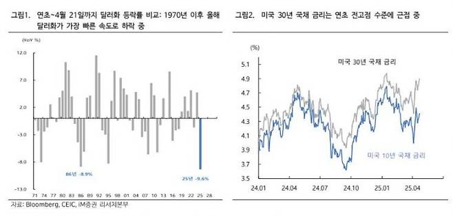 iM증권은 최근 달러화 급락은 미국 도널드 트럼프 행정부 정책에 대한 시장의 우려나 경고일 수 있다고 22일 분석했다.