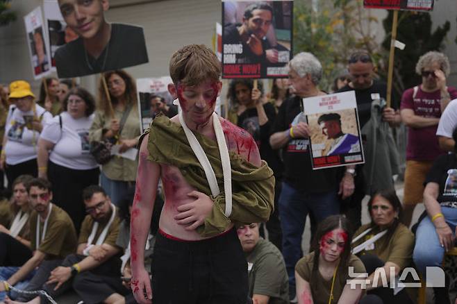 [텔아비브=AP/뉴시스] 21일(현지 시간) 이스라엘 텔아비브에서 가짜 피 등으로 분장한 오피르 앙그레스트가 활동가들과 함께 2023년 10월 7일 키부츠 나할 오즈에서 하마스 무장 세력에 납치된 그의 형이자 이스라엘 군인인 마탄 앙그레스트의 석방을 촉구하고 있다. 2025.04.22.