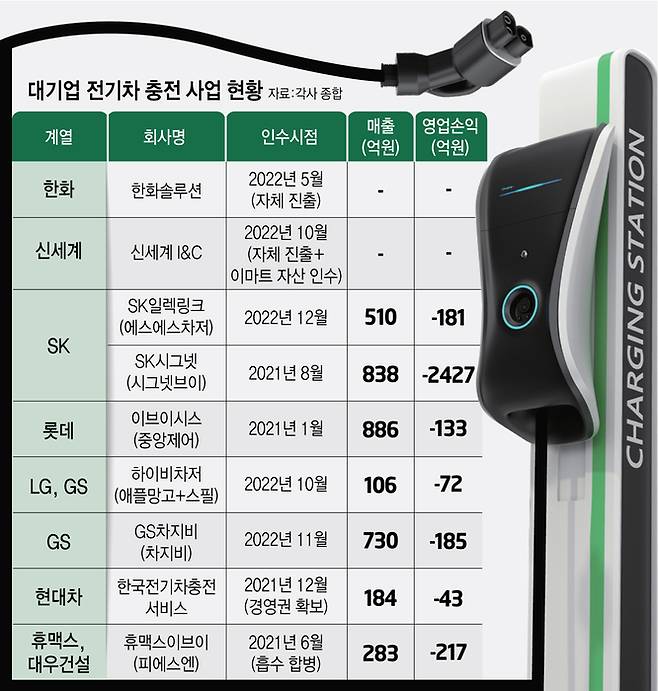 ㈜SK가 2021년 인수한 SK시그넷(옛 시그넷이브이)은 지난해 2428억원의 대규모 영업손실을 냈고, 최근 1500억원의 유상증자를 받기로 했다. 롯데이노베이트가 2021년 초 인수한 이브이시스(옛 중앙제어)도 지난해 133억원 규모의 적자를 냈다.