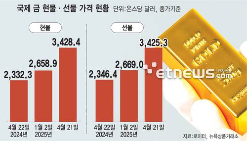 국제 금값이 온스당 3400달러를 돌파하며 고공행진을 이어가고 있다.