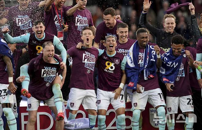 [번리=AP/뉴시스] 번리 선수들이 21일(현지 시간) 영국 번리의 터프 무어에서 열린 2024-25 챔피언십(2부 리그) 44라운드에서 셰필드 유나이티드를 꺾은 후 환호하고 있다. 번리는 셰필드를 2-1로 꺾고 남은 경기 결과와 상관없이 프리미어리그 승격을 확정했다. 2025.04.22.