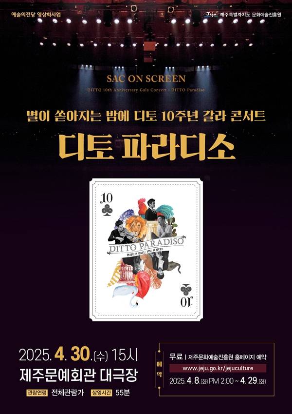 제주도 문화예술진흥원(이하 진흥원)은 올해 서울 예술의전당 우수 공연 영상화 사업인 'SAC on Screen'(Seoul Arts Center on Screen) 공모에 선정되면서, 11월까지 제주문예회관 대극장에서 공연 영상 8편을 상영한다.