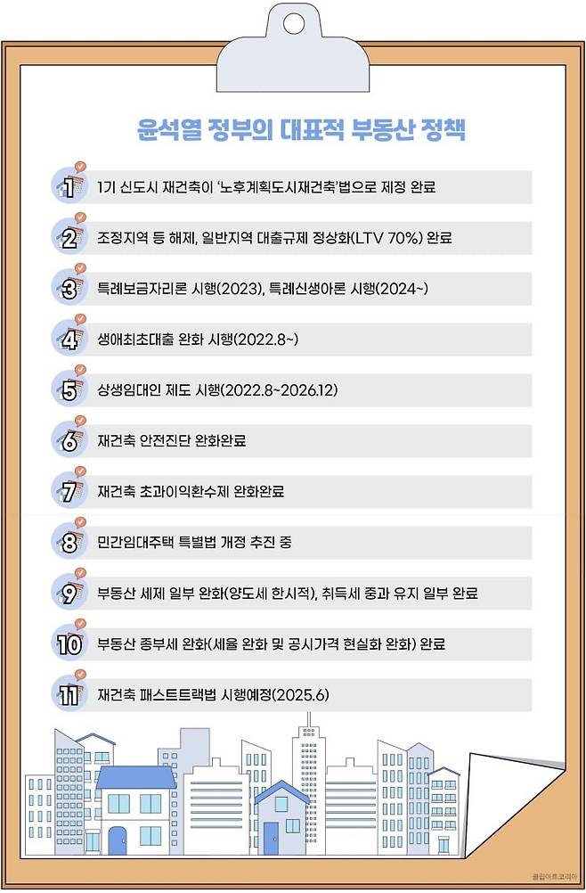 A. 윤석열 정부에서는 부동산과 관련한 조세를 취득세를 제외하고는 사실상 모조리 완화한 상태이며, 종부세와 양도세를 완화했습니다. 또 공시가격 자체를 시세의 90% 수준에서 65% 수준으로 다시 낮췄기 때문에 보유재산과세가 낮아졌습니다. 한편, 임대차법에 대해서는 임기초 개정의지가 있었으나, 개정으로 이어진 바 없습니다. 윤 정부 후반부에는 주택임대사업을 위한 법인을 증가시킬 목적의 민간임대법을 개정하고 시행하려 했고, 재건축 초과이익환수제도 폐지하려 했으나, 제도 발표 후 4개월 만에 발생한 계엄으로 인해 수포로 돌아갈 가능성이 큽니다. 새 정부는 아마도 이러한 논란이 있을 법한 제도들에 대해서는 적극적 스탠스를 취하지 않을 가능성이 크기에, 정책상 불확실성이 존재합니다.