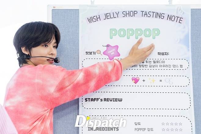 "통통 튀는 매력과 NCT 위시의 청아한 감성이 어우러진 댄스 팝이에요. 사랑에 빠져 세상이 팝팝 터진다는 뜻이에요. 당도 5점, 팝팝 감도 5점, 시즈니 선호도 5점." (리쿠)