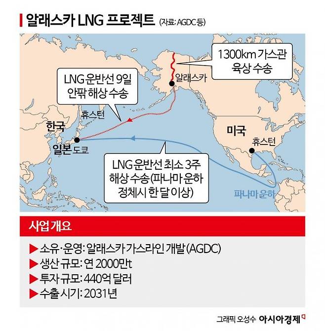 이 프로젝트는 알래스카 북부 가스전에서 시추한 천연가스를 파이프라인으로 남부 니키스키까지 1300㎞ 옮긴 다음 우리나라를 비롯해 일본·대만 등 아시아 국가에 수출하는 초대형 에너지 사업이다. 총사업비가 440억달러(약 62조원)에 달한다. 본격적인 수출은 2031년부터 이뤄질 전망이다. 알래스카 지역에 가스관이 깔리면 한국으로의 LNG 운송 기간은 일주일이 걸릴 것으로 보인다. 대규모 매장지인 미국 텍사스에서 한국까지 수송이 3주가 소요된다는 점을 감안하면 운송기간이 3분의 1로 줄어드는 것이다.