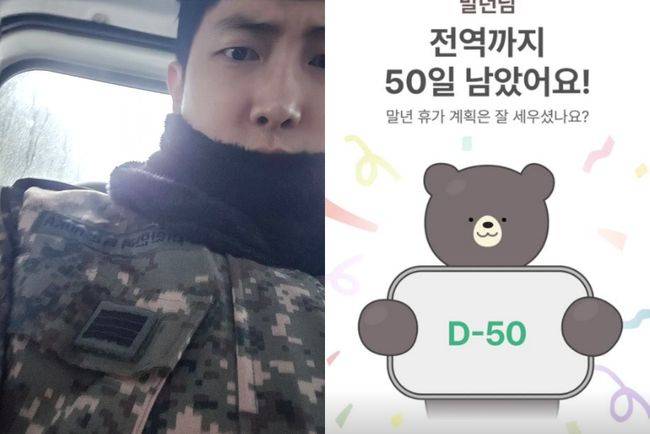 해당 이미지는 전역일까지 남은 시간을 계산한 것으로, "전역까지 50일 남았어요! 말년 휴가 계획은 잘 세우셨나요?"라는 문구가 적혀 있어 눈길을 끈다.