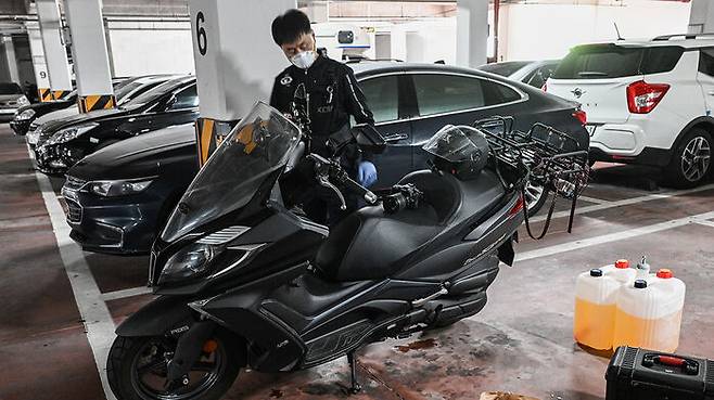 ▲ 21일 서울 관악구 봉천동 한 아파트에 화재가 발생, 과학수사대원들이 아파트 지하주차장에서 유력 용의자가 사용한 것으로 추정되는 인화물질과 오토바이를 감식하고 있다.