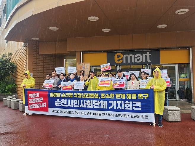 사회대개혁 순천시민행동은 오늘(22일) 이마트 순천점 앞에서 기자회견을 열고, "직장 내 괴롭힘 사건이 발생하고 회사가 인지한 지 수개월이 지나도 관련자 분리 조치가 이뤄지지 않았다"며, "사건 처리 과정에서 공정성도 상실했다"고 주장했습니다.