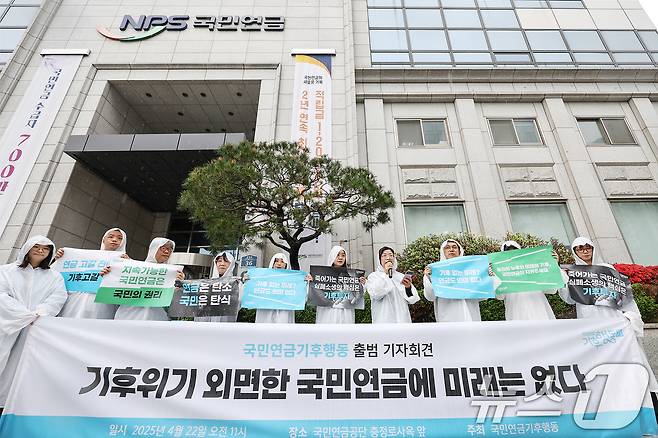 (서울=뉴스1) 민경석 기자 = 국민연금기후행동 관계자들이 22일 오전 서울 서대문구 국민연금공단 충정로 사옥 앞에서 '국민연금기후행동 네트워크 출범 기자회견'을 하고 있다.