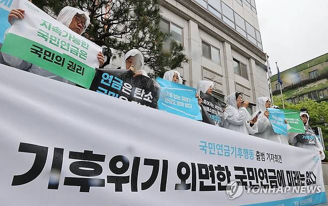 (서울=연합뉴스) 이재희 기자 = 지구의 날인 22일 서울 서대문구 국민연금 충정로사옥 앞에서 열린 시민단체 국민연금기후행동 출범식에서 참석자들이 손팻말을 들고 있다. 2025.4.22
