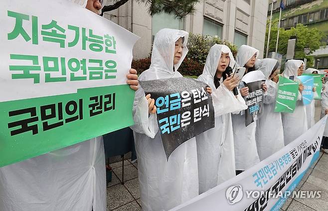(서울=연합뉴스) 이재희 기자 = 지구의 날인 22일 서울 서대문구 국민연금 충정로사옥 앞에서 열린 시민단체 국민연금기후행동 출범식에서 참석자들이 손팻말을 들고 있다. 2025.4.22