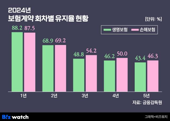 특히 보험상품 판매(계약 체결) 역할을 맡고 있는 설계사들에 대한 수수료 선지급 기간이 종료되는 3년(37회차) 유지율은 50%로 급락했다. 5년(61회차) 유지율은 46.3%에 불과하다.