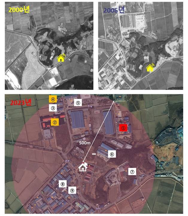 | ▲ 주민 D씨 집 주변 환경변화 항공사진 ①2000년 주민 D씨 집 주변 갯벌과 논밭 사진 ②2006년 집 앞 공장이 들어선 사진 ③2023년 주민 D씨 집 반경 500미터 이내 환경위험시설 사진 (왼쪽부터 시계방향) |