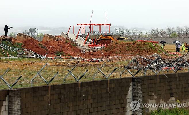 (무안=연합뉴스) 조남수 기자 = 22일 전남 무안국제공항에서 제주항공 여객기 사고 원인을 조사 중인 항공철도사고조사위원회 관계자들이 방위각 시설(로컬라이저) 현장 조사하고 있다. 2025.4.22
