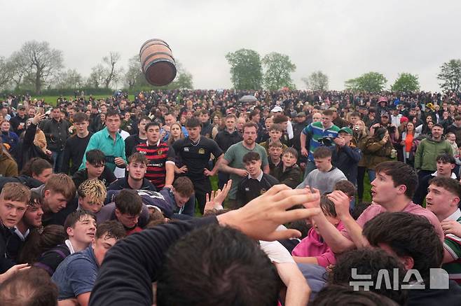 [할러턴=AP/뉴시스] 21일(현지 시간) 영국 할러턴과 메드번 마을 주민들이 전통 '병 차기'(bottle-kicking) 경기를 치르고 있다. 매년 부활절 월요일에 열리는 이 경기에서 참가자들은 약 1갤런(약 3.8리터)의 맥주가 담긴 나무통을 1.6㎞ 공터 양 끝에 있는 자기 마을의 개울로 옮기기 위해 치열하게 몸싸움을 벌인다. 이 행사는 영국 내에서도 독특한 지역 풍습 중 하나로 꼽히며, 마을 공동체의 힘을 보여주는 생생한 전통으로 이어지고 있다. 2025.04.22.