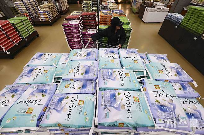 일본 총무성이 지난 18일 발표한 '3월 소비자물가'에 따르면 일본 전국 쌀값의 평균은 5kg이 4214엔(약 4만 2000원)으로, 전년 동월 대비 92.1%나 올랐다. 1971년 1월 이후 54년 만에 가장 큰 폭의 상승률이다. 일본의 농협 온라인 쇼핑몰과 도쿄 신오쿠보의 한국슈퍼마켓에서 팔린 이 쌀들은 전남 해남군 옥천농협에서 생산한 땅끝햇살 브랜드로 모두 완판됐다. 2025.04.22. ks@newsis.com