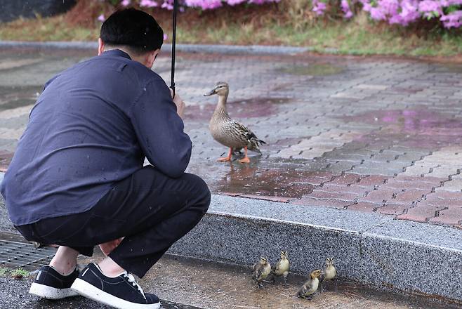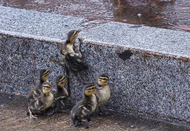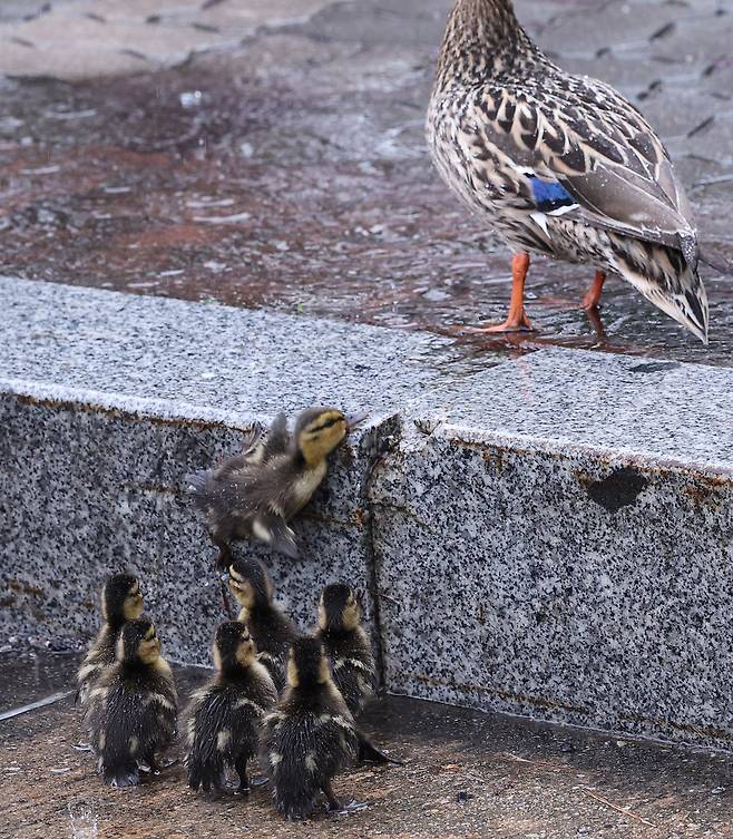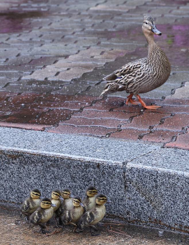 비가 내린 22일 서울 여의도 국회박물관 앞에 어미 오리를 따라 새끼 오리 7마리가 종종 걸음으로 따라 가고 있었다.