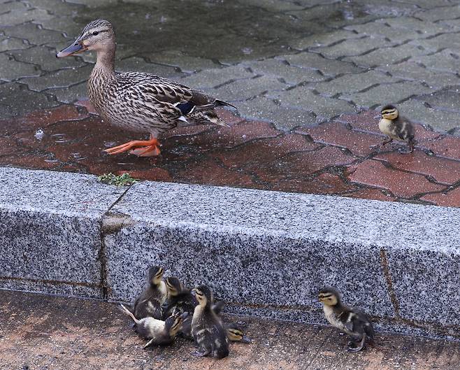 비가 내린 22일 서울 여의도 국회박물관 앞에 어미 오리를 따라 새끼 오리 7마리가 종종 걸음으로 따라 가고 있었다. 그 모습이 귀여워 가만히 지켜봤다. 어미 오리가 보도블럭 경계석에 올라가자 뒤따라 가던 새끼 오리들은 좀처럼 올라가지 못했다. 아기 오리들 주변으로 하수구가 있어 더 불안해 보였다. 그러자 안절부절못한 어미 오리는 경계석 아래로 다시 내려왔고, 그 일을 몇 번이나 반복하고 있었다. 마침 오리들을 지켜보고 있던 한 시민이 박스 조각을 가지고 와서 아기 오리들이 무사히 올라갈 수 있도록 도와 주었다.