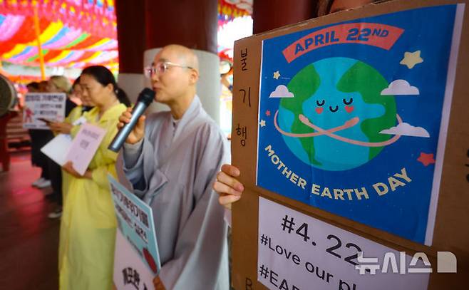 [서울=뉴시스] 황준선 기자 = 지구의 날인 22일 서울 종로구 조계사 일주문에서 불교환경연대 회원들이 지구의 날 맞이 환경 보호 캠페인을 하고 있다. 2025.04.22. hwang@newsis.com