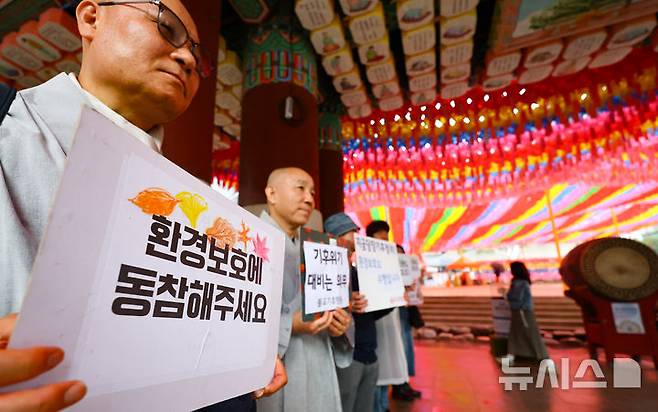 [서울=뉴시스] 황준선 기자 = 지구의 날인 22일 서울 종로구 조계사 일주문에서 불교환경연대 회원들이 지구의 날 맞이 환경 보호 캠페인을 하고 있다. 2025.04.22. hwang@newsis.com