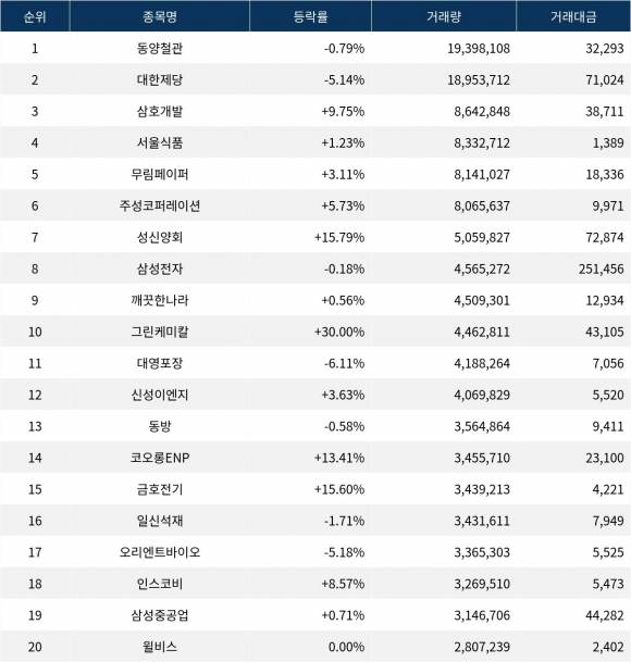 한편 거래량 상위 20위권 종목들은 대영포장(014160)(009770) ▼6.11%, 신성이엔지(011930)(011930) ▲3.63%, 동방(004140)(004140) ▼0.58%, 코오롱ENP(138490)(102940) ▲13.41%, 금호전기(001210)(001210) ▲15.60%, 일신석재(007110)(007110) ▼1.71%, 오리엔트바이오(002630)(002630) ▼5.18%, 인스코비(006490)(006490) ▲8.57%, 삼성중공업(010140)(010140) ▲0.71%, 윌비스(008600)(008600) 0.00% 등의 성적을 기록했다.
