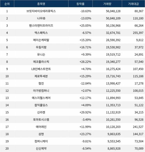 한편 거래량 상위 20위권 종목들은 협진(138360) ▼12.84%, 아가방컴퍼니(013990) ▲2.07%, 에스지헬스케어(398120) ▲12.17%, 원익홀딩스(030530) ▲4.09%, 신라젠(215600) ▲29.92%, 토마토시스템(393210) ▼3.49%, 에어레인(163280) ▲11.99%, 삼현(437730) ▲23.27%, 컴퍼니케이(307930) ▼9.81%, 신신제약(002800) ▼8.54% 등의 성적을 기록한다.