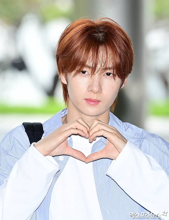 이날 녹화에 참석한 그룹 투어스(TWS) 영재가 출근길에 포토타임을 갖고 있다.