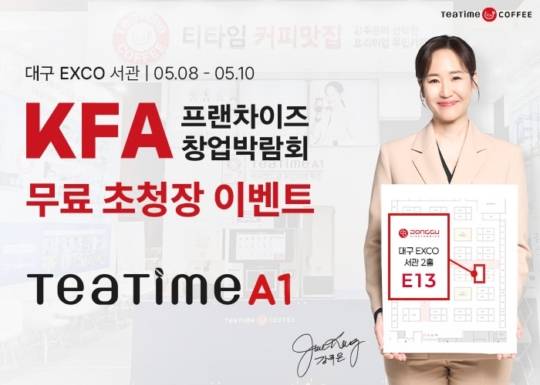 한편, 대구 KFA 창업박람회는 사전 등록자에 한하여 무료입장이 가능하며, 티타임A1 홈페이지를 통해서 무료초청장을 신청할 수 있다. 무인카페머신 구매 시 24개월 무이자 할부 혜택을 비롯한 다채로운 5월의 특급 혜택을 제공하는 프로모션을 진행하고 있어 보다 자세한 내용은 홈페이지에서 확인할 수 있다.