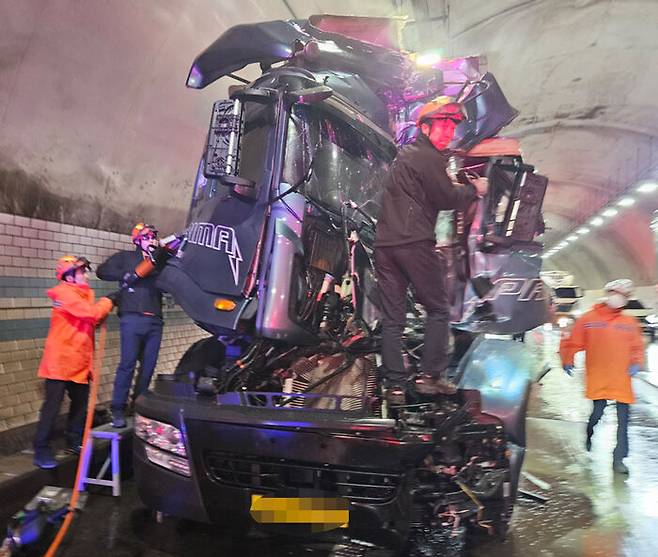 오늘(22일) 낮 12시 12분 충북 보은군 회인면 청주영덕고속도로 청주 방향 수리티 터널 내에서 8.5t 화물차가 정체 구간에 멈춰있던 9.5t 화물차와 14t 화물차를 잇달아 들이받았습니다.