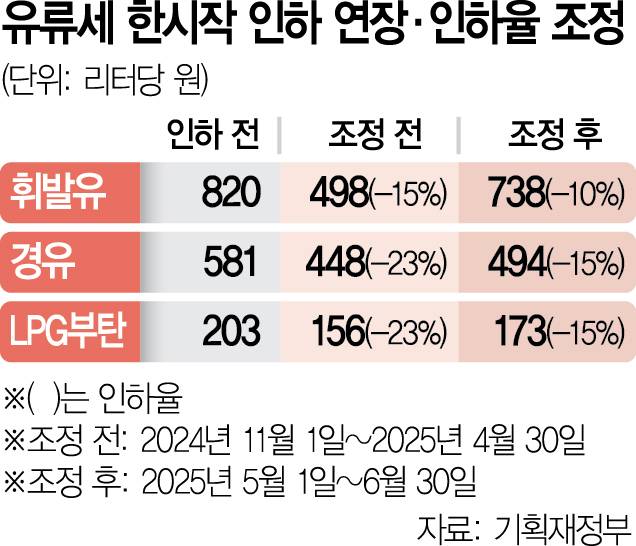 휘발유 인하율은 당초 15%에서 10%로, 경유 및 액화석유가스(LPG) 부탄 인하율은 23%에서 15%로 축소된다.
