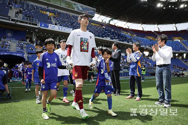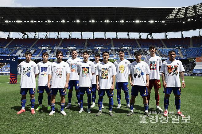 경기에 나서는 울산 선수들이 울산시 발달 장애인 미술센터 ‘다다름 미술&디자인’(이하 다다름) 작가들의 작품 티셔츠를 착용한 채로 경기장에 입장했다.