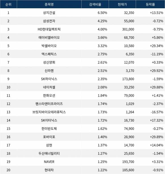 이어 검색비율 2위의 삼성전자(005930)는 하락률 0.72%로 소폭 하락 마감했다. 검색비율 3위의 HD현대일렉트릭(267260)은 9.75% 하락 마감했다. 검색비율 4위 에이비엘바이오(298380)는 5.86% 상승 마감했다. 검색비율 5위 박셀바이오(323990)는 29.34% 상승하며 상한가로 마감했다.